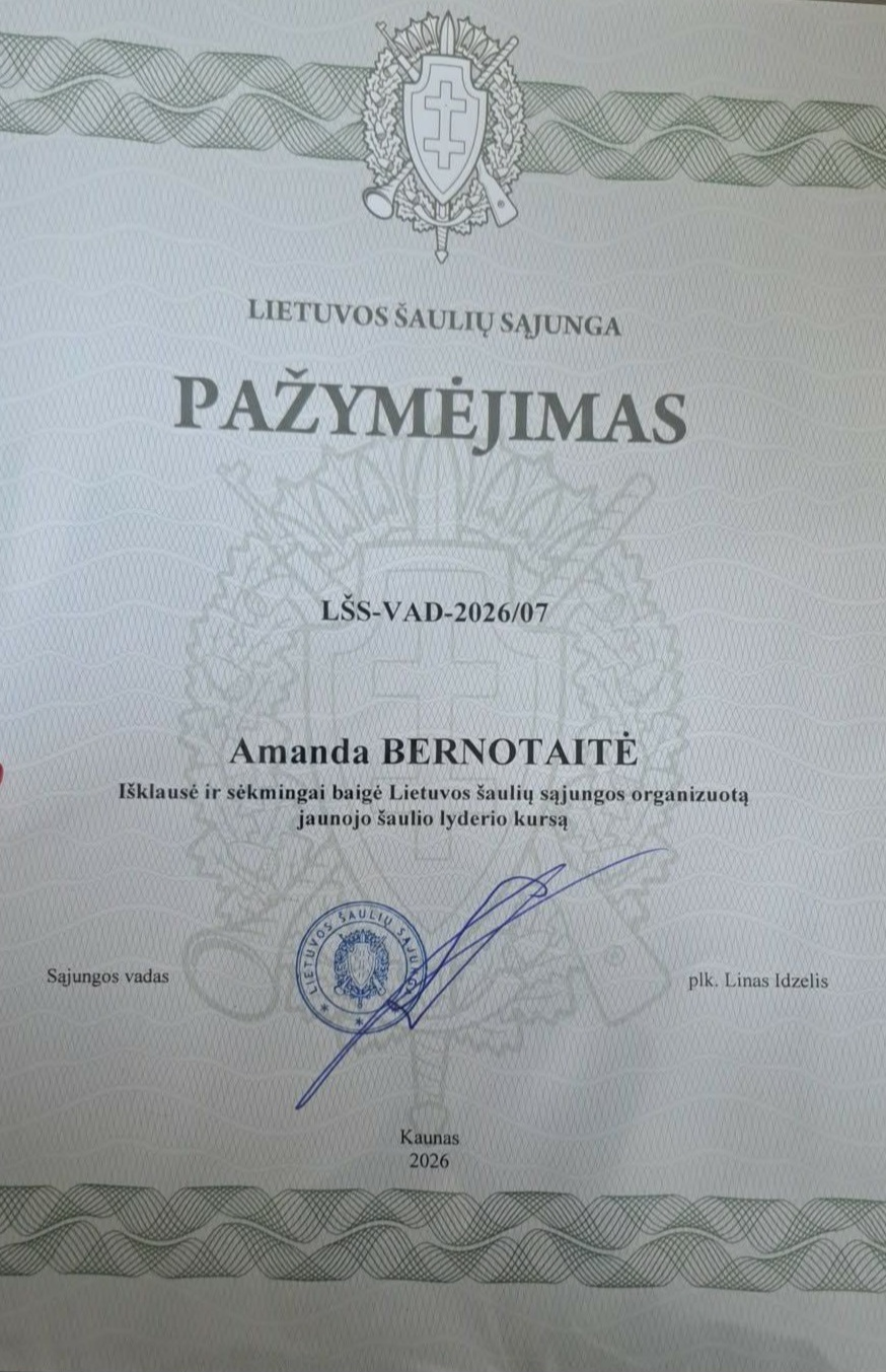 Vasario 15–19 dienomis Kaune vyko Jaunojo šaulio lyderio kursas, kuriame dalyvavo ir Veliuonos Jaunųjų šaulių būrio vadė Agnė Maskolaitytė ir būrininkė Amanda Bernotaitė. Užsiėmimuose jos atliko įvairias komandines užduotis ir mokėsi tapti geresnėmis lyderėmis. Galime pasidžiaugti, kad abi Jaunosios šaulės sėkmingai įveikė šį kursą ir gavo pažymėjimus.