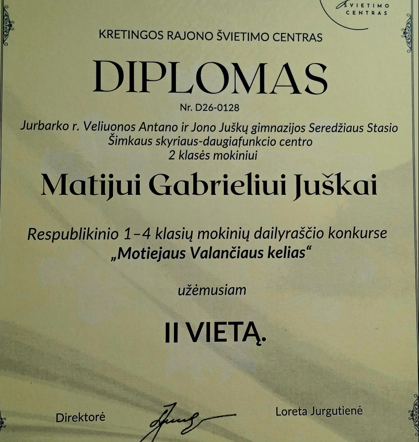 Vasario mėnesį vyko respublikinis bendrojo ugdymo mokyklų 1–4 klasių mokinių, dailyraščio konkursas „MOTIEJAUS VALANČIAUS KELIAS“, skirtas Motiejaus Valančiaus 225-ųjų gimimo metinių paminėjimui. Dailyraščiu rašė ir darbus atsiuntė net 89 mokiniai iš Lietuvos respublikos bendrojo ugdymo mokyklų. Išrinkti nugalėtojus buvo sudėtinga, nes darbai buvo parašyti be klaidų. Vertinimo komisija atsižvelgė į taisyklingą raidžių rašymą ir jų jungimą. Veliuonos Antano ir Jono Juškų gimnazijos Seredžiaus Stasio Šimkaus skyriaus-daugiafunkcio centro antros klasės mokinys Matijas Gabrielius Juška, atsakingai ir labai kruopščiai atlikęs užduotį, šiame Respublikiniame konkurse užėmė antrą vietą. Mokiniui įteiktas diplomas. Sveikiname Matijų Gabrielių, dėkojame jam už kruopštumą, gebėjimą susikaupti ir už norą tobulėti.