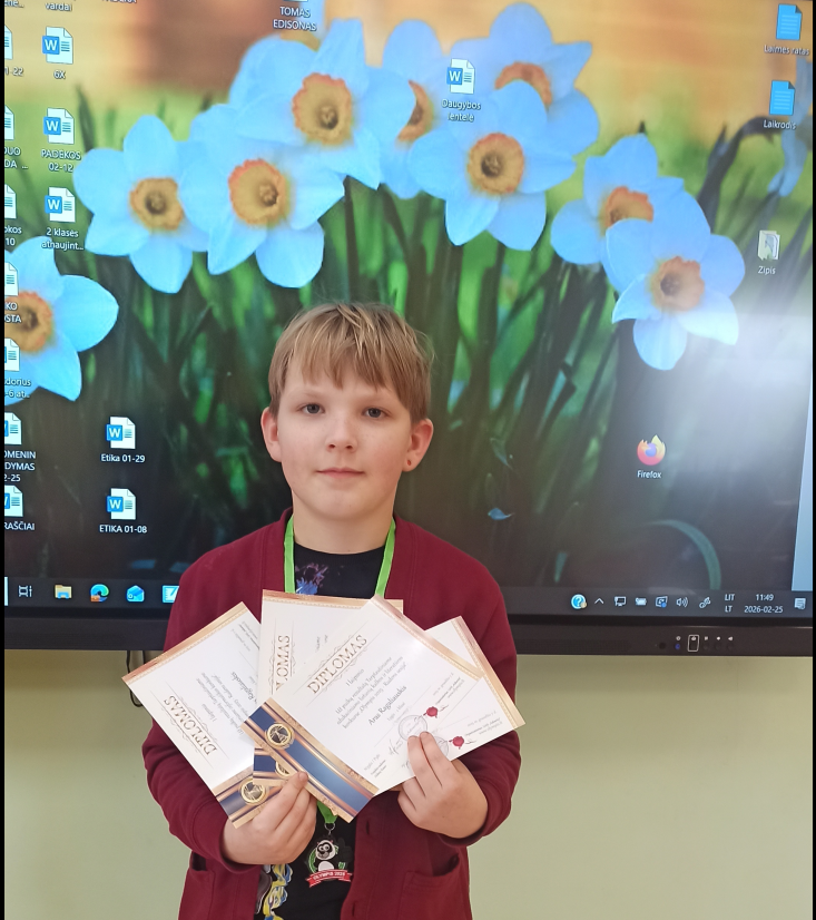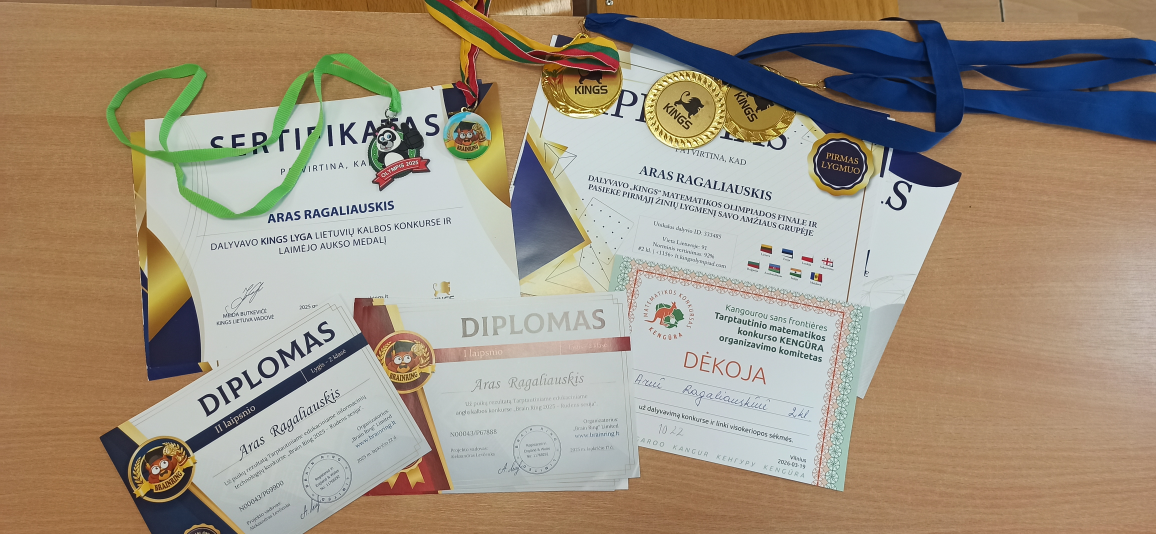Aras Ragaliauskis – gimnazijos 2 klasės mokinys, besimokantis aukštesniuoju lygiu. Labai džiugu, kad šis berniukas ne tik puikiai mokosi, bet ir dalyvauja įvairiuose tarptautiniuose konkursuose. Į gimnaziją „plūsta“ laiškai su įvairiausiais apdovanojimais bei medaliais. Tai medalis, I laipsnio diplomai už dalyvavimą lietuvių kalbos ir literatūros, biologijos, anglų kalbos, matematikos konkurse bei II laipsnio diplomas už dalyvavimą informacinių technologijų konkurse „Brain Ring 2025 – Rudens sesija“. Gimnazijos direktorė D. Saulėnienė įteikė „puokštę“ medalių, kurie atkeliavo už puikius rezultatus tarptautiniame „Kings lyga“ konkurse – aukso medaliai už pasiekimus lietuvių kalbos, anglų kalbos, matematikos konkursuose. Šiame konkurse Aras pasiekė II žinių lygį informacinių technologijų, logikos olimpiadoje. Jau antrus metus šis antrokas dalyvauja konkurso „Olympis“ rudens–pavasario sesijose ir pasiekia puikių rezultatų – medalis ir I laipsnio diplomai už anglų kalbos, lietuvių kalbos ir litetatūros, matematikos, informatikos konkurso rezultatus. Šiemet Aras išbandė jėgas konkurse „Kengūra“. Sėkmės Arai! Tavo puikūs rezultatai džiugina ir mus – Tavo draugus bei mokytoją Daivą!