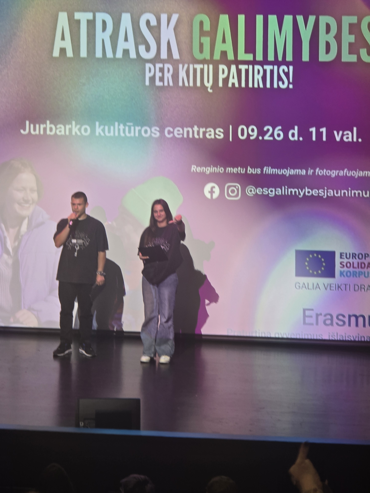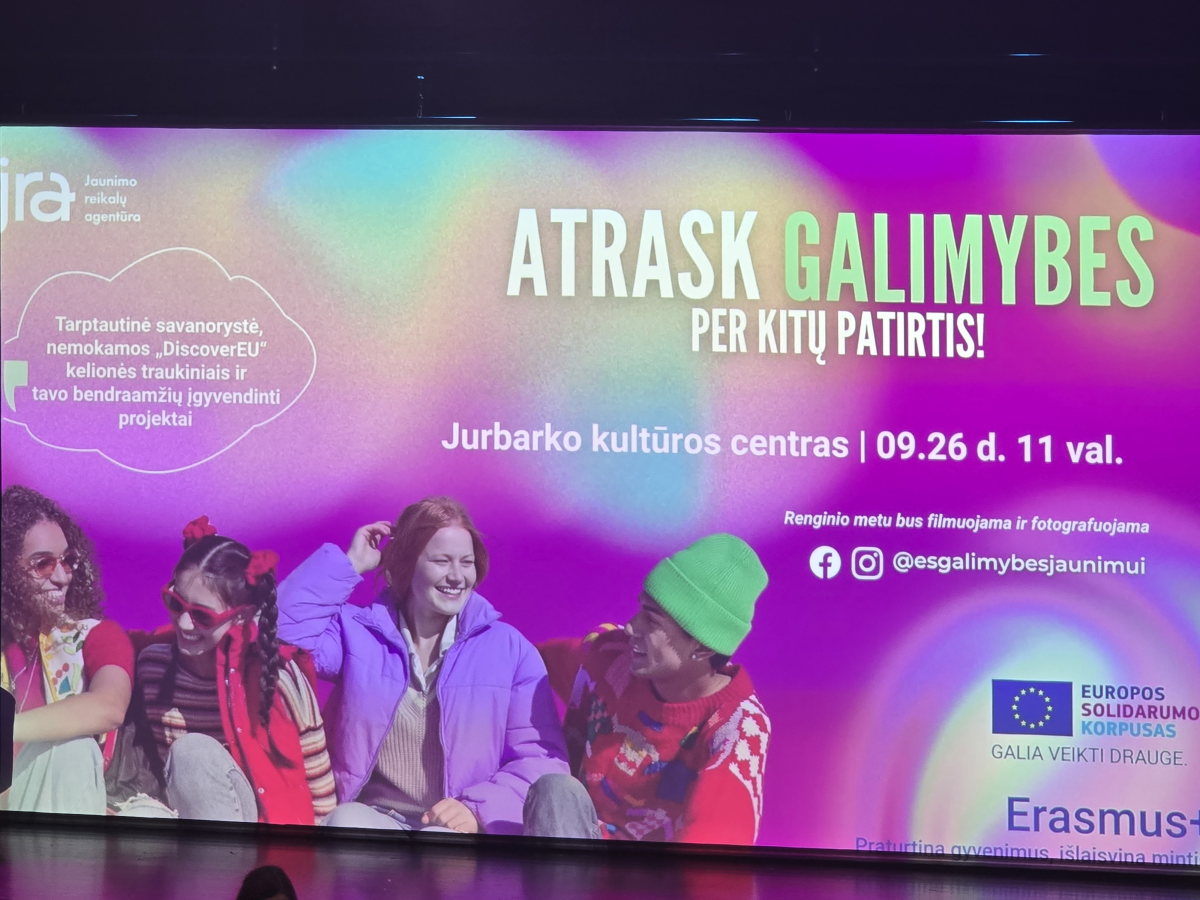 Rugsėjo 26 d. 11 val. Jurbarko kultūros centre vyko Jaunimo reikalų agentūros organizuojamas susitikimas „Atrask galimybes per kitų patirtis!“. Tai itin svarbus renginys mūsų rajonui – pirmą kartą tokio masto galimybės pristatomos čia pat, Jurbarke. Renginys ypatingas tuo, kad Jaunimo reikalų agentūra atvyko tiesiogiai į Jurbarką ir pristatė jaunimui skirtas galimybes. Mūsų gimnazijos mokiniai turėjo galimybę plačiau susipažinti su savanorystės galimybėmis, Erasmus programa ir kitais jaunimo vykdomais projektais.