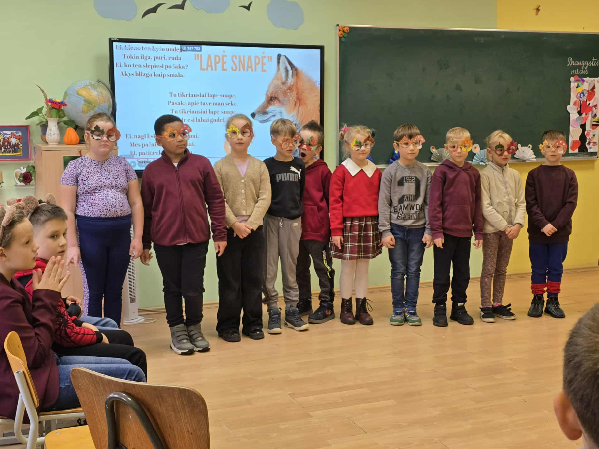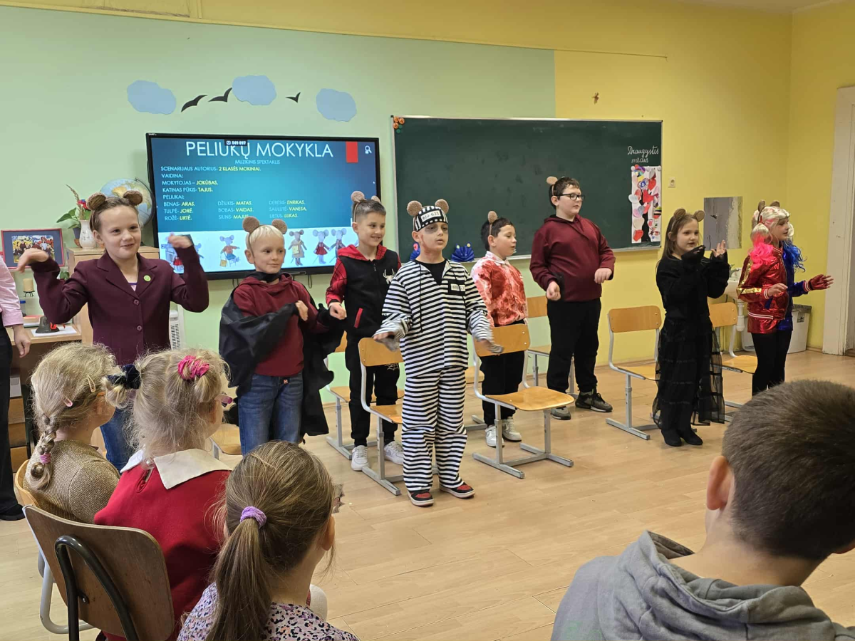 Paskutinę spalio dieną vyko 1–4 gimnazijos klasių integruota pamoka ,,Rudenėlio pasakaitės“, kurios metu vaikai šoko, dainavo ir deklamavo eiles apie rudenį, vaidino spektakliuką „Peliukų mokykla“, surengė išskaptuotų moliūgų parodą – dalinosi jau šiais mokslo metais sukauptu žinių „derliumi“!