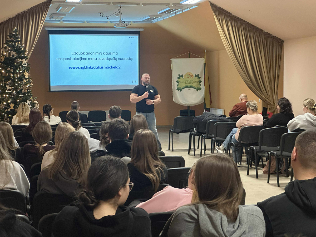 Gruodžio 12 d. Veliuonos A. ir J. Juškų gimnazijoje vyko prevencinis renginys „Pokalbiai apie...“, kurį organizavo Jurbarko rajono savivaldybės Visuomenės sveikatos biuras. Jo metu lektoriai Dalius Mackela, Justė Gaučaitė ir Vaidas Venclovas remdamiesi gyvenimiška patirtimi, suteikė mokiniams žinių apie psichoaktyviųjų medžiagų poveikį fizinei ir psichikos sveikatai bei socialiniam gyvenimui, skatino sąmoningą ir atsakingą požiūrį į jų vartojimą. Renginio metu buvo ugdomas mokinių kritinis mąstymas, gebėjimas atsispirti neigiamai bendraamžių įtakai ir priimti sveikatai palankius sprendimus.