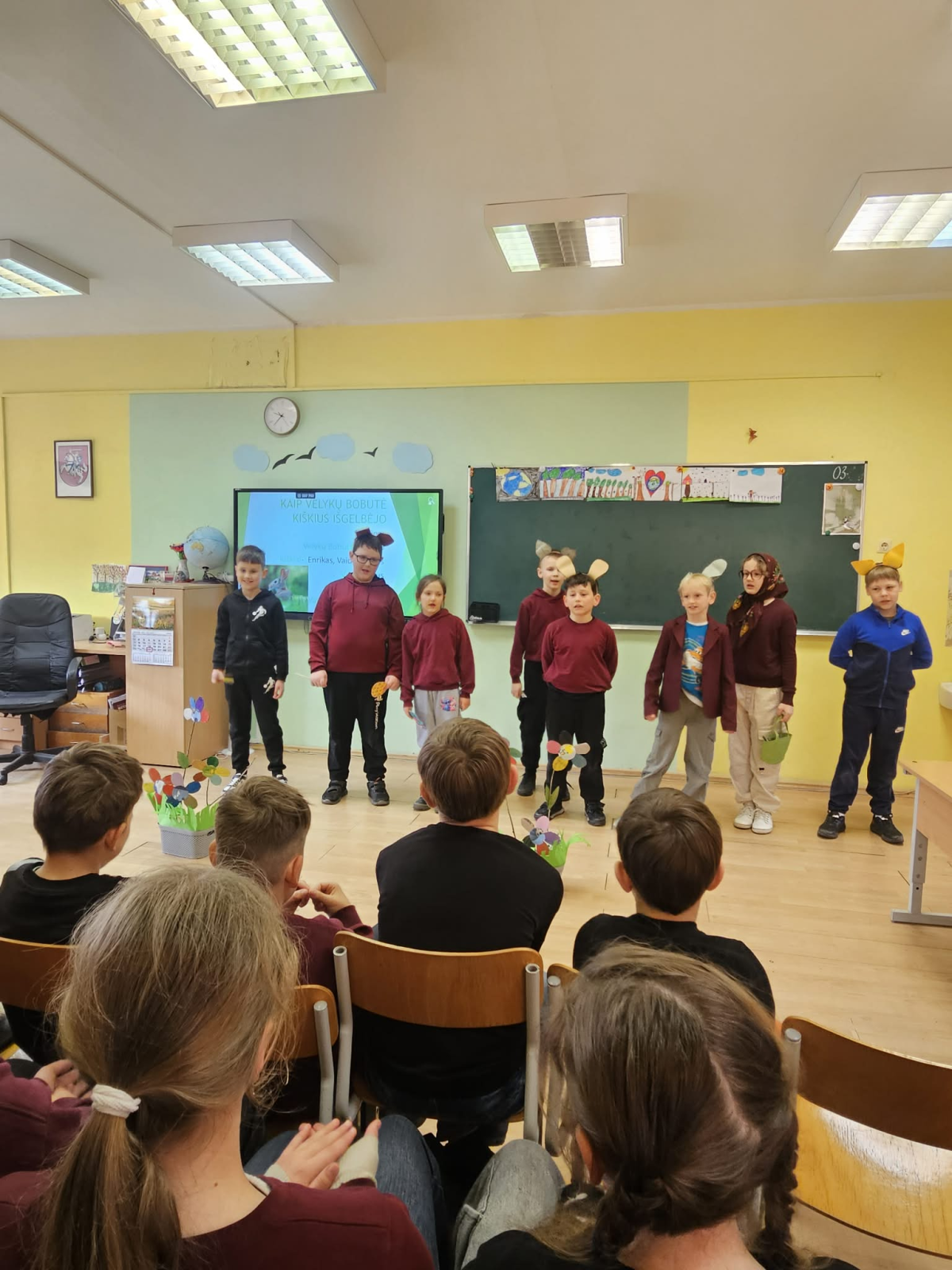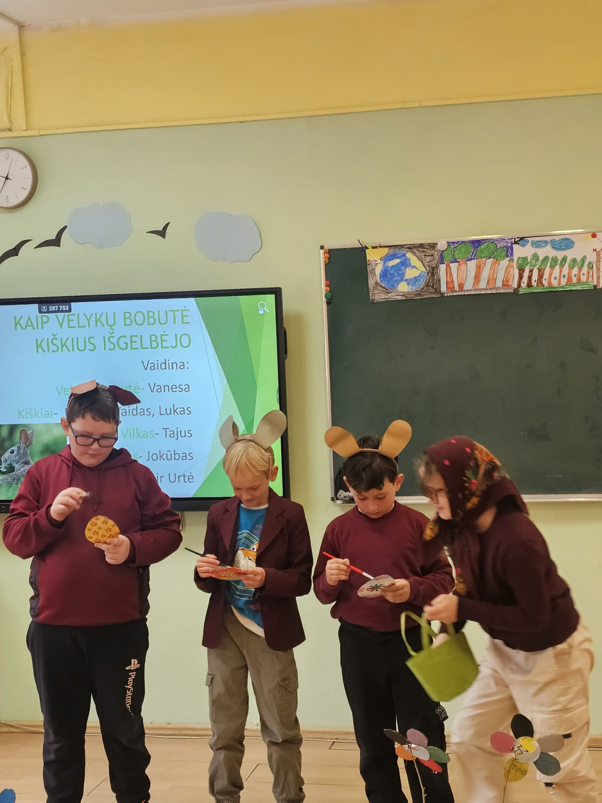 Gimnazijos pradinių klasių mokiniai, sugrįžę po pavasario atostogų, linksmai toliau šventė Velykas. Pirma integruota pamoka linksmai prabėgo sporto salėje, bežaidžiant įvairius judrius žaidimus. Vėliau visi stebėjo antrokų sukurtą spektaklį „Kaip Velykų bobutė kiškius išgelbėjo“, minė mįsles, atliko linksmas užduotis apie Velykas. O tada mokiniai išskubėjo į Veliuonos kultūros centrą, kur visus pasitiko Velykų Zuikis. Jis pakvietė ridenti margučius, pasivaržyti linksmose rungtyse. Vieni kitiems linkėjo būti stipriems ir sveikiems, tarsi patiems tvirčiausiems Velykų stalo margučiams.