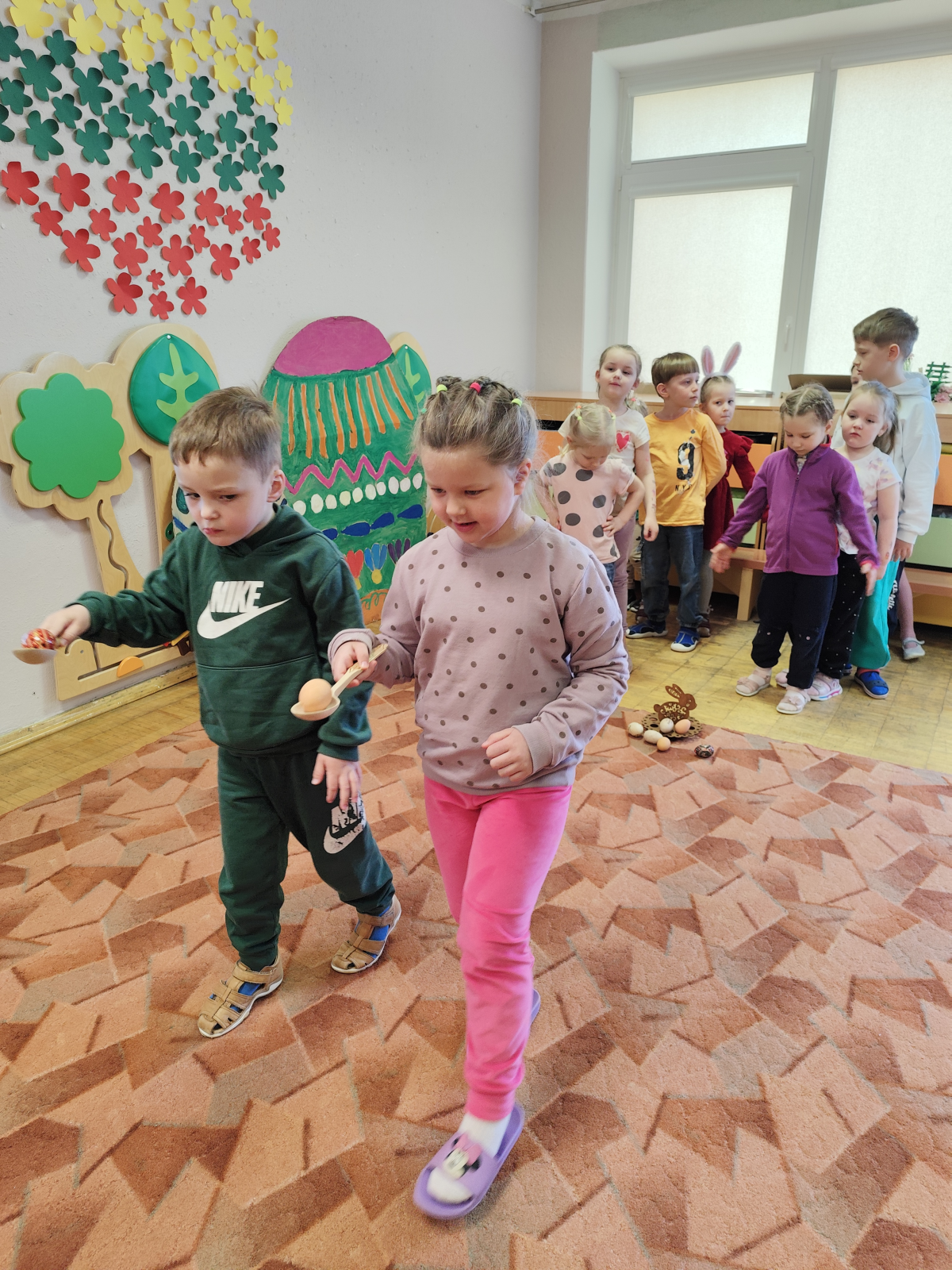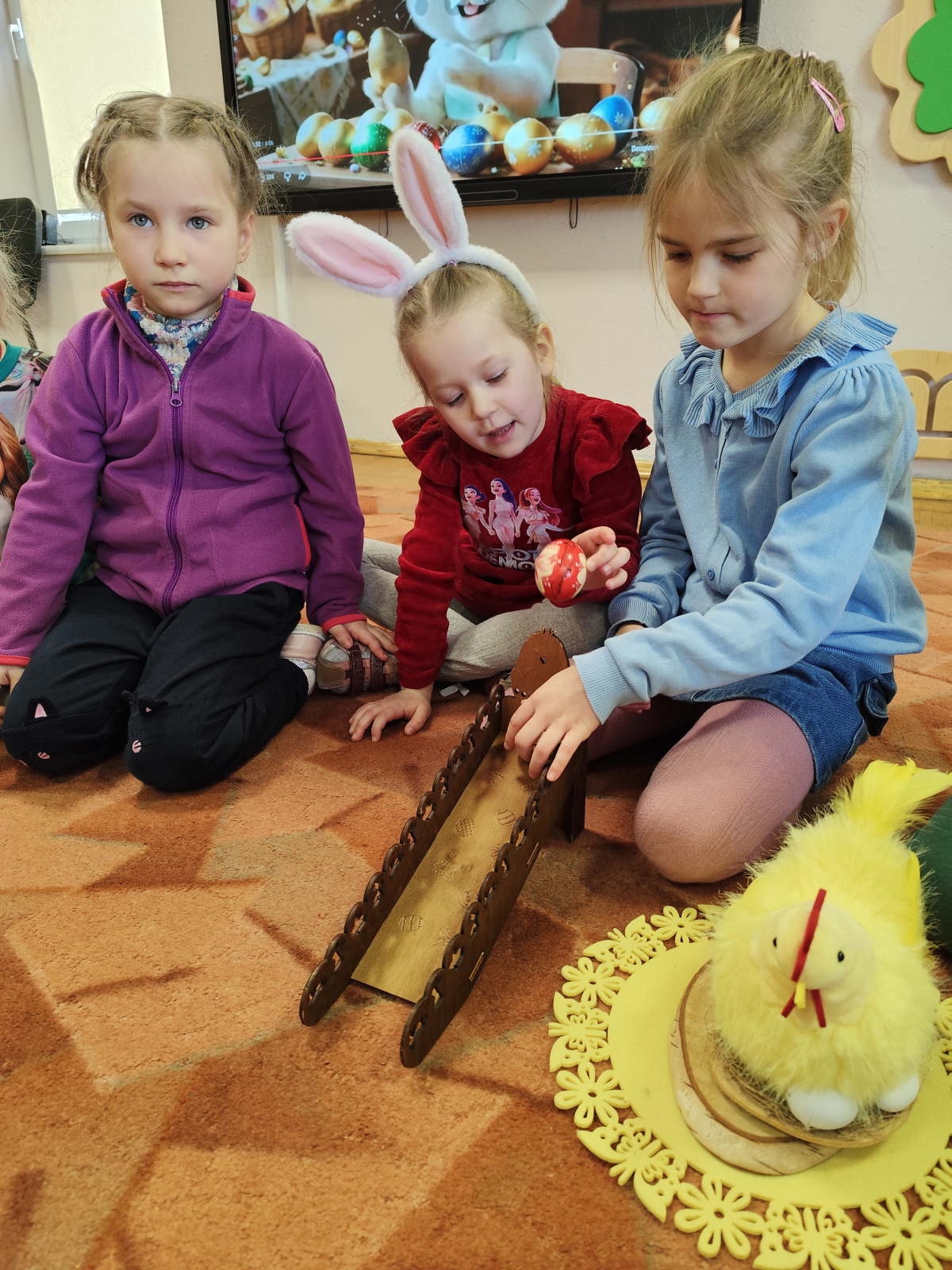 Velykinio rytmečio metu salę užpildė skambios dainelės apie pavasarį, mįslių spėliojimai ir azartiškas margučių ridenimas. Kiekvienas riedantis margutis nešė linkėjimą žemei nubusti, o vaikams – daug juoko ir atradimų.