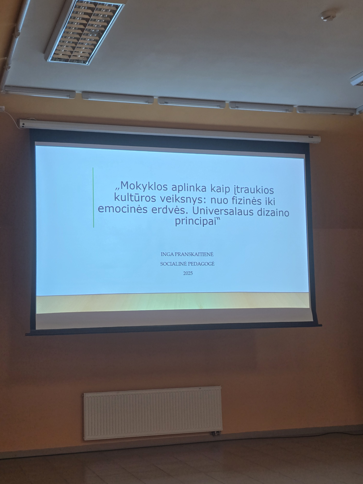 Pagal TŪM programą Jurbarko rajono mokyklose organizuojamos paskaitos tėvams. Spalio 17 d. 15.00 val. mūsų gimnazijoje lankėsi Jurbarko švietimo centro socialinė pedagogė Inga Pranskaitienė. Ji vedė paskaitą tėvams, mokytojams ir mokinio pagalbai specialistams, kurios tema ,,Mokyklos aplinka kaip įtraukios kultūros veiksnys: nuo fizinės iki emocinės erdvės. Universalaus dizaino principai“. Buvo kalbama apie įtraukų ugdymą, jo idėją, jog kiekvienas vaikas yra svarbus ir turi teisę mokytis įtraukioje aplinkoje. Vyko diskusijos apie šio ugdymo problemas ir iššūkius. Pasidžiaugta, kad mūsų gimnazijoje besimokantiems specialiųjų poreikių mokiniams teikiama mokinio pagalba. Mažais, bet užtikrintais žingsniais visa mokyklos bendruomenė stengiasi kurti pačias geriausias sąlygas šiems mokiniams.